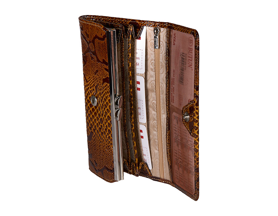 Классический женский кошелек из кожы. Под клапаном находится отделение на молнии и три отделения для купюр. Так же есть кармашки для пластиковых, визитных карточек.