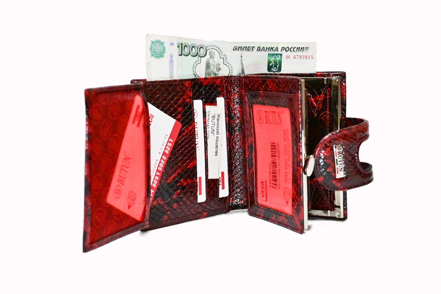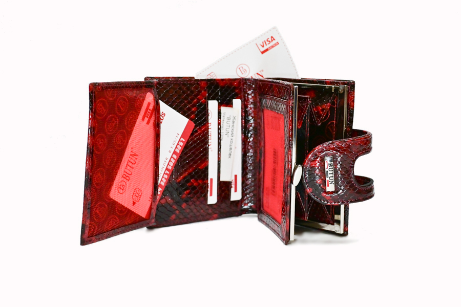 Внутри имеется 2 отделения для купюр, так же 6 кармашков для визитных, кредитных карт и потайной карман.