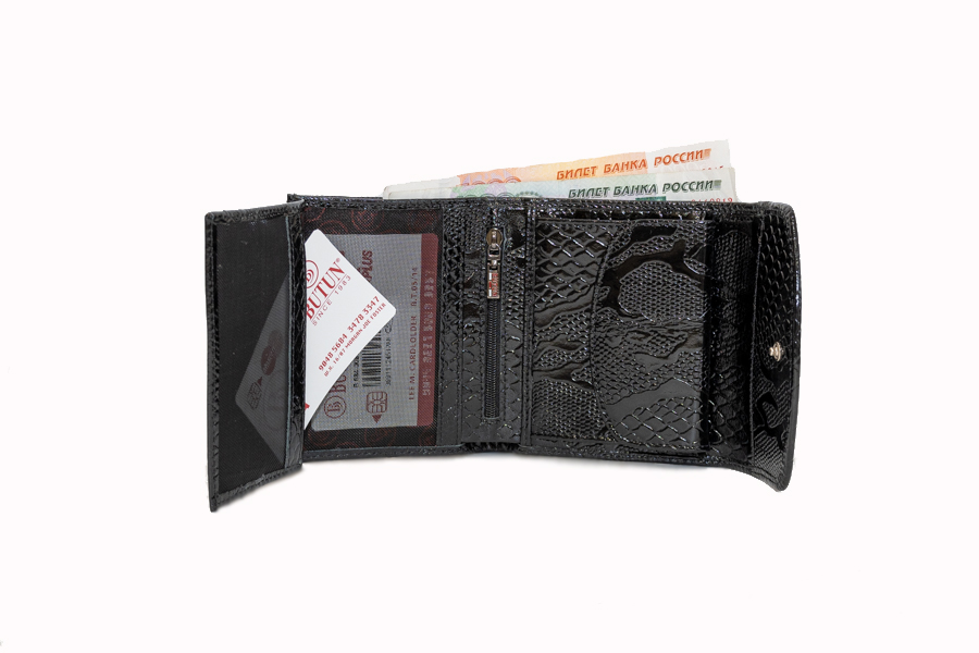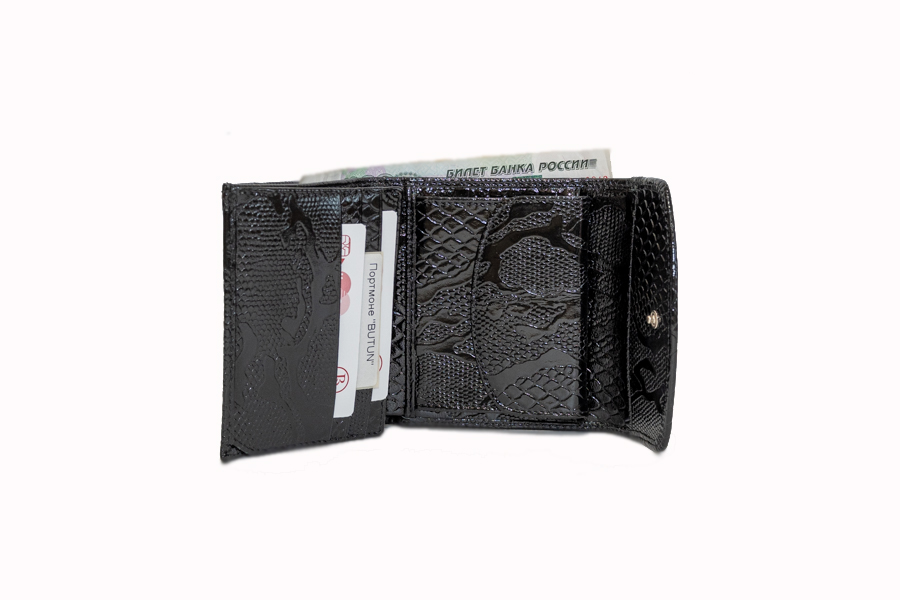 Женский кошелек выполнен из натуральной износостойкой кожи с модным тиснением змея. Кошелек имеет несколько отделения для визиток и банковских карт, так же есть отделение для мелочи.