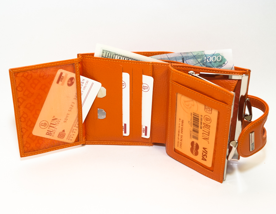 Классическое женское портмоне оранжевого цвета из кожи. Внутри имеется 2 отделения для купюры, так же 6 кармашков для визиток или кредитных карточек и потайной карман. Очень удобно в использовании несколькими SIM картами для мобильных телефонов, для них имеется два кармашка для хранения симок. Два отделения в прозрачную сеточку для документов. Отделение для мелочи выполенно на металическом замке (поцелуй). Весь кошелек закрывается на кожаный ремешок с кнопкой, на обороте которого установлен логотип производителя компании Butun.